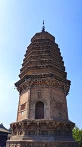 随后,基地班师生前往圆觉寺砖塔进行参观。圆觉寺砖塔是大同地区现存唯一的一座密檐塔。建于金正隆三年(1158),塔高九层,密檐飞拱,通体砖砌,呈八角形,全仿木结构建筑。座基四周雕满砖刻浮雕,其中的舞乐人像姿态各异,逼真动人,对研究古代民族文化,特别是北方民族的歌舞、乐器有一定的价值。雕刻的花鸟禽兽,也各具形态,楚楚动人。