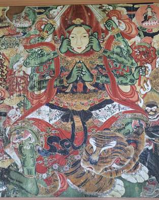 经过讲解,我们了解到永安禅寺始建于金代,后遭火毁,又于元延祐二年(1315年)重建,并在明、清之际屡有修茸。永安禅寺的建筑沿中轴线依次为山门、天王殿和传法正宗殿,两侧东西配殿有观音殿、伽蓝殿、达摩殿、雷神殿及关帝殿。其中,传法正宗殿内壁的元、明、清三代壁画给同学们留下了深刻的印象。传法正宗殿内壁壁画分为135组895尊人物,面积为186.912平方米,后壁绘十大明王三教仙佛鬼神,体量高大。在看到北壁东侧西起第一身明王时,同学们纷纷驻足观赏。这位明王绿面红发,三头八臂,上双手各持一剑,胸前双手合掌,亲手撕开自己凶狠的外貌脸皮,露出里层的慈眉善目,左下手持法轮,坐骑为虎,生动彰显了佛的本色。而当讲解员通过冷光手电筒照射壁画来展示立体描金工艺时,同学们不禁发出阵阵惊叹。