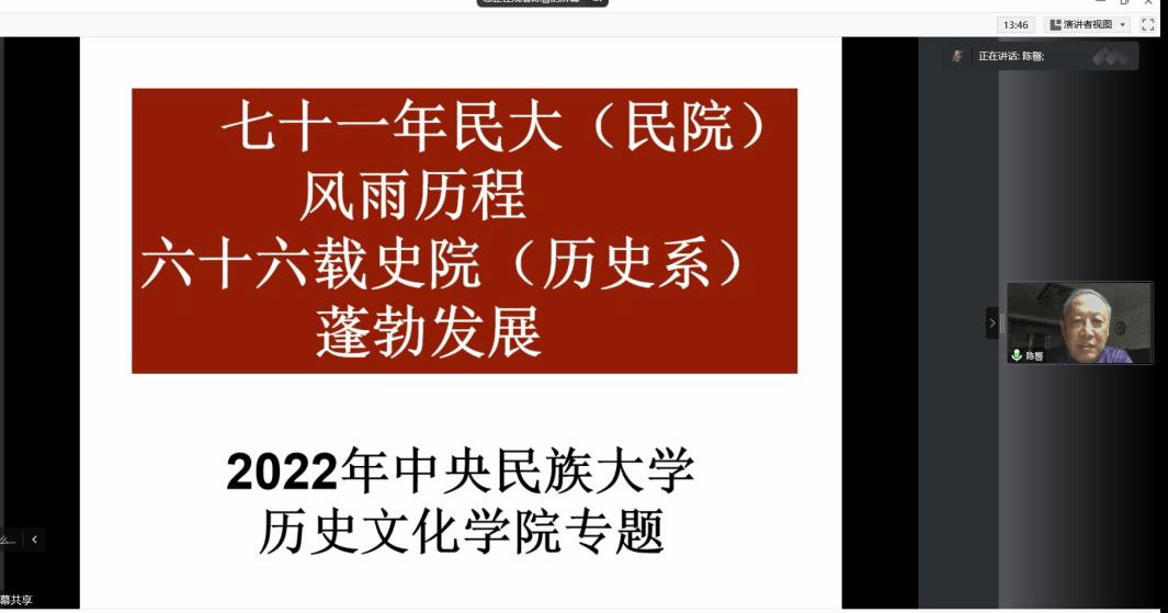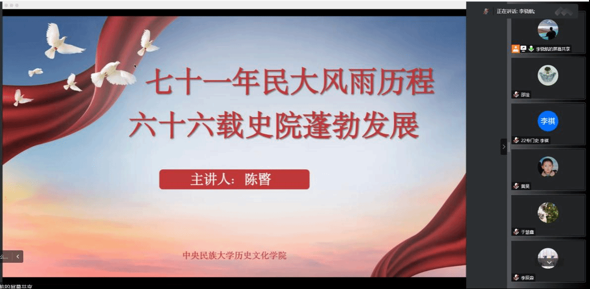 关心下一代委员会副主任陈暋老师为2022级新生党支部开展了“七十一年民大风雨历程,六十六载史院蓬勃发展”的专题党课。本次党课采用腾讯会议线上方式进行,2022级学生党支部党员及部分入党积极分子参加了学习。