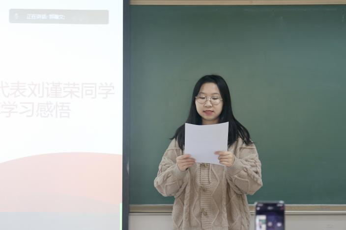 仪式第一项,本期党校培训班优秀学员代表刘谨荣同学分享了自己的学习感悟。作为学生代表,刘谨荣呼吁大家要紧记时代的重托,持之以恒,在实践中学知识、强理论、长才干、作贡献,不断完善和提高自我,为构建和谐社会贡献青春智慧和力量。