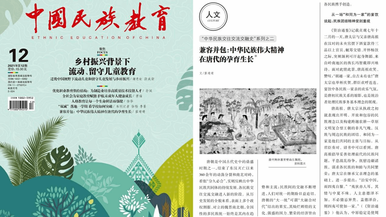 廖靖靖博士撰写的《兼容并包:中华民族伟大精神在唐代的孕育生长》(2021年第12期),主要关注中华民族“兼容并包,和同为一”的伟大精神在唐代的孕育生长。结束南北朝分裂局面的唐朝,在政治、文化、经济上都被认为是古代史上的“治世”、“盛世”,是中华民族共同体意识发展的重要阶段,各民族的心理认同、互鉴、凝聚是共同培育伟大精神的良壤。唐初高祖、太宗定立了民族团结和融合的基本政策,并成为此后二百余年朝廷及各级官员处理民族关系、相关事务的重要依据。边疆诸族从渐慕华风到主动华夏化,外来文化在包容的环境下被吸收、融入,实现在地化,孕育出“兼容并包”“和同为一家”的中华民族精神,深刻影响后世,彰显了“我们伟大的精神是各民族共同培育的”。