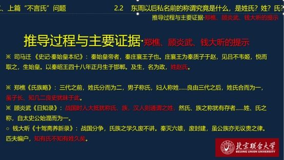 随后,祁萌老师向我们分享了他的推导过程与主要证据。祁老师举述了司马迁《史记》所著秦始皇“姓赵氏”的例子,并引述郑樵、顾炎武、钱大昕对这一问题的判断(见图2),指出现代学者讨论春秋战国时期的“姓”“氏”问题,以承续司马迁的看法为主,以“姓氏合一”“姓氏合流”描述姓、氏关系的变迁,而未继承郑樵等人的观点。但这种主流看法的问题在于:主要依据传世文献而非实际使用;基本是后人的后见之明,遮蔽时人自己的观念;宗法制与姓氏关系的认识前提。