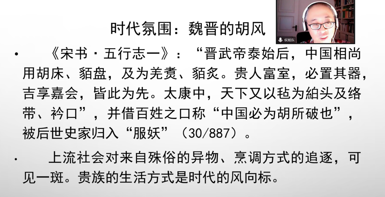 第二部分为“青衣行酒”的时代背景。侯教授以南匈奴的墓葬考察为例展开了详细的阐述。他首先对比了东汉南匈奴的墓葬与原先位于蒙古高原的匈奴墓葬,指出了前者已经丧失匈奴原有的墓葬特色并逐渐向汉人墓葬风格发展的现实情况,得出了南匈奴当时正日益趋同于主流文化的结论。在论述中,侯教授还提出了宗教信仰与风俗相对于物质文化更难改变的观点,同时通过史料分析指出了当时的权贵对“胡风”的喜爱。基于上述的相关分析,侯教授总结出了当时“万邦朝于西晋”的天下秩序构造特点,并运用丰富的图片和文字阐述了天下秩序中四夷的地位以及汉晋时期天下秩序的构建方式。