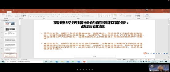 张老师首先指出战后日本经济高速增长的背景是战后改革。在美国的主导下,日本战后经历了政治、经济、社会和思想教育等改革,这些改革促使日本从战时体制中脱离出来,为之后日本经济的高速增长提供了基础。